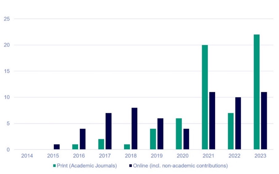 With a look at German contributions on climate change litigation, we can see that legal scholars were late to the party. Figure 1 features scholarly publications on climate litigation in print and online academic journals. It illustrates a significant increase (only) in 2021, the year when, in April, the Federal Constitutional Court issued its above-mentioned climate decision. The same holds true for books, with a little delay due to the heavier publication process. Figure 2 compares non‑academic online contributions to academic print journals and shows that climate litigation has been reported on at least since 2015; however, the significant increase of scholarly contributions happened only after the Constitutional Court’s decision in 2021.