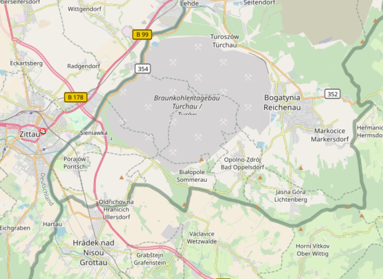 Braunkohletagebau, probably one of the most German words existing, means opencast mining for lignite coal: basically the removal of complete landscapes to excavate and turn into electric energy immense amounts of particularly dirty carbon-not-yet-dioxide. The mining field of Turów is currently the object of a legal dispute between the Czech Republic and Poland before the ECJ. The operating permit had expired in 2020 and was extended by the Polish authorities until 2026 without conducting a regular environmental impact assessment. This is particularly delicate because the impacted environment in question is quite predominantly – see the map – not in Poland, but in Germany and the Czech Republic.