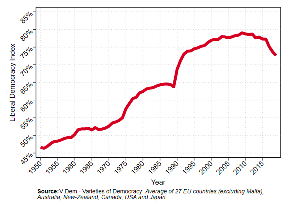 Den Prozess einer „Erosion der Demokratie“ hat Wolfgang Merkel anhand des Index der liberalen Demokratie mit einer Grafik veranschaulicht (Vorlesung am 1. Oktober 2021). Die Grafik zeigt, dass die Qualität der Demokratie, gemessen am Index der liberalen Demokratie des Projektes „Varieties of Democracy“, in der EU, Australien, Kanada, Neuseeland, den USA und Japan seit den 1950er Jahren zunimmt und seit 2010 abnimmt.