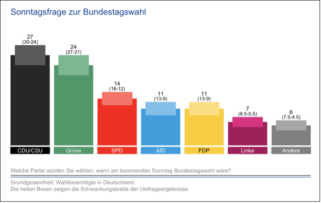 Die durch Institute und Medien veröffentlichten Umfragewerte suggerieren in der Regel mehr Präzision, als es angesichts dieser Fragen angebracht wäre. Eine Möglichkeit, Wähler:innen auf Teile der Unsicherheiten von Umfragewerten aufmerksam zu machen, ist die Darstellung von Schwankungsbreiten. Einfach gesprochen: Diese zeigen den Bereich an, in dem sich ein Umfragewert mit hoher Wahrscheinlichkeit bewegt. Schwankungsbreiten liefern zwar kein vollständiges Bild über die Zuverlässigkeit einer Umfrage((Die Schwankungsbreite bildet nicht die Gesamtheit der Unsicherheiten einer Umfrage ab. Mögliche Stichproben- oder Gewichtungsfehler werden nicht dargestellt. Schwankungsbreiten fassen in der Regel also lediglich die Genauigkeit von Umfragewerten anhand der Anzahl der befragten Personen ins Auge. Einer jeden Umfrage ist solch eine Unsicherheit inhärent, da stets nur ein Bruchteil der Bevölkerung befragt wird.)), sie unterstreichen allerdings den Fakt, dass Sonntagsfragewerte mit Vorsicht zu betrachten sind.