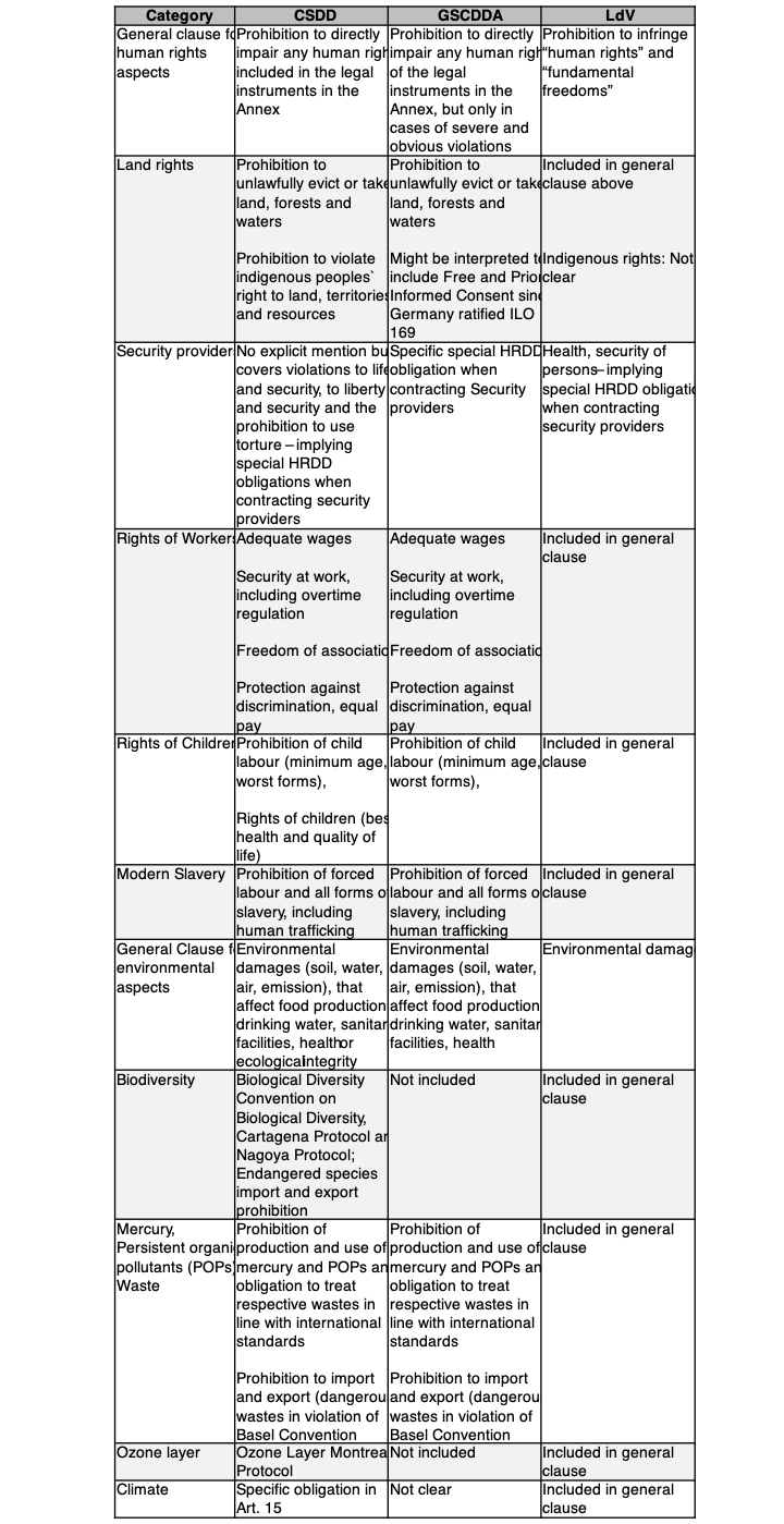In Art. 4-11, the CSDDD sets out HREDD obligations which all refer to “adverse impacts” that need to be managed. Adverse environmental impacts are defined in Annex II of the CSDDD, and adverse human rights impacts in Annex I.((Schönfelder, in: Grabosch (Hrsg.), Das neue LkSG, 1. Aufl. 2022, § 4, Rn. 9 ff.)) The explanatory memorandum does not make reference to the role of decisions of the UN bodies in interpreting the provisions. However, as all CSDDD risk provisions refer to specific Articles of international covenants, it stands to reason those interpretations should be taken into account to interpret the respective terms. The following table summarizes relevant rights and impacts which are included under the CSDDD in comparison to the GSCDDA and the LdV: