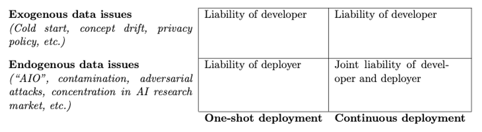 For constructing a liability framework we therefore analyse data quality as a function of exogenous issues, such as cold start (underrepresented data), concept drift (when data becomes outdated), and data availability because of privacy concerns. At the other extreme, data quality can be understood as a function of endogenous issues, such as agents trying to “game the system”, for example with the AI equivalent of search engine optimization or adversarial attacks that inject biased/selected data.