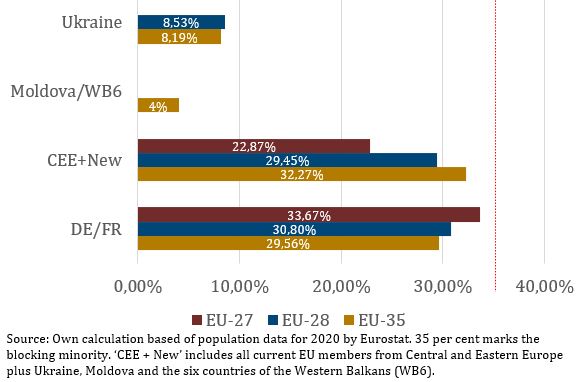 The same is not true, however, if we take Moldova and the WB6 into account. As mostly small countries with less than 10 million inhabitants, they would still each get their own veto rights in all questions of unanimity even if they would together account only for roughly 4 per cent of the population of an EU of 35 countries.
