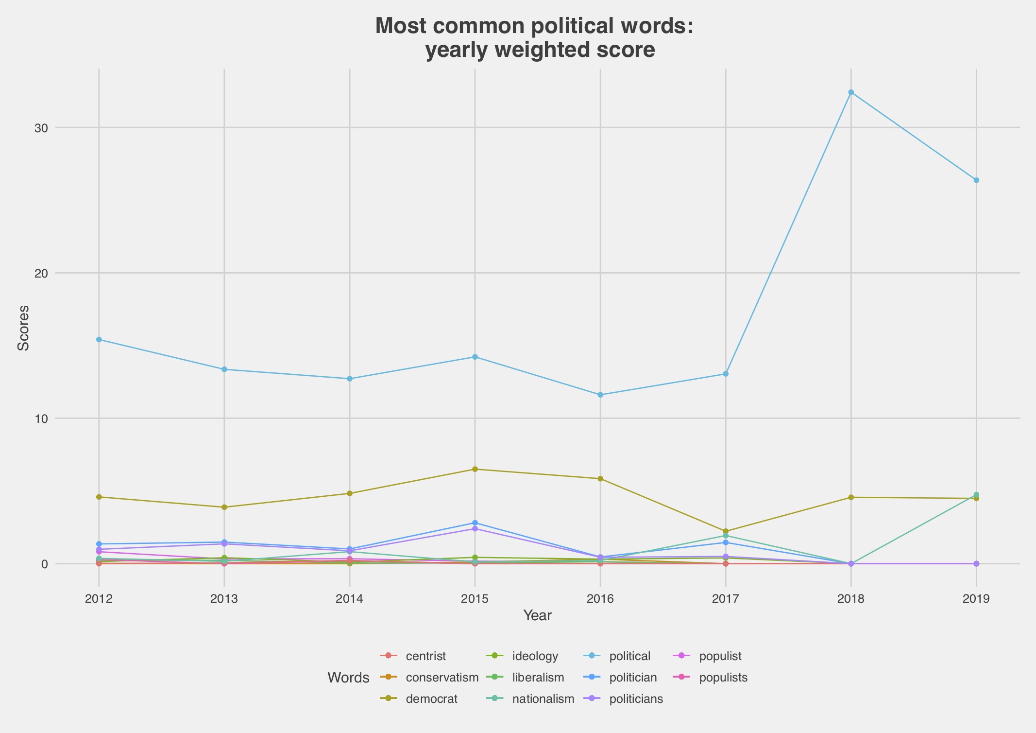 We might suspect the word “populism” to be closely tied to the debate triggered by democratic backsliding in Poland and Hungary, which has featured prominently in recent contributions to the blog. However, looking at how the most-recurring political words in our computer-generated lexicons have varied over time in the English contributions, the populist surge doesn’t seem to be driving the growing attention to politics. In fact, among these most-recurring words (remember that our lexicons encompass up 500 terms), only the adjective “political” displays a clear increase in relative use.