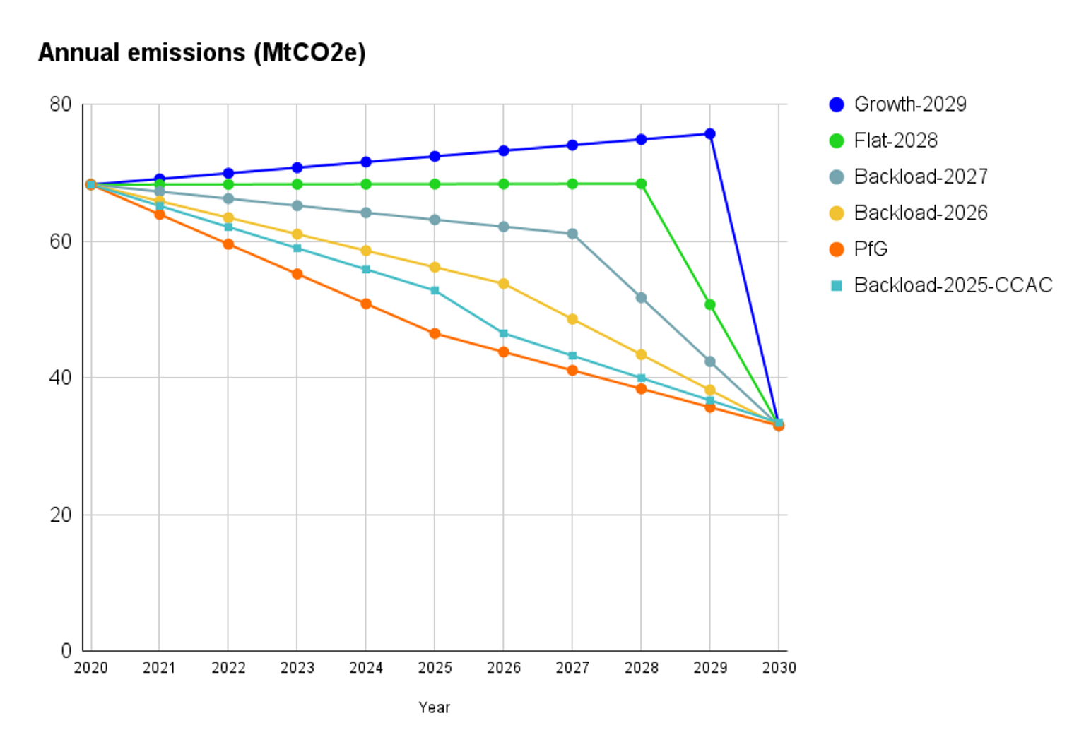 However, this instruction did not meaningfully constrain the carbon budgets that could be proposed and adopted, because there are lots of different pathways between Ireland’s annual emissions in 2018 and its annual emissions that are 51% below this in 2030, and each of these pathways has a different carbon budget associated with it. This is well illustrated by the Figure below: the carbon budget associated with each pathway (the area ‘under the line’ in each case) varies wildly.