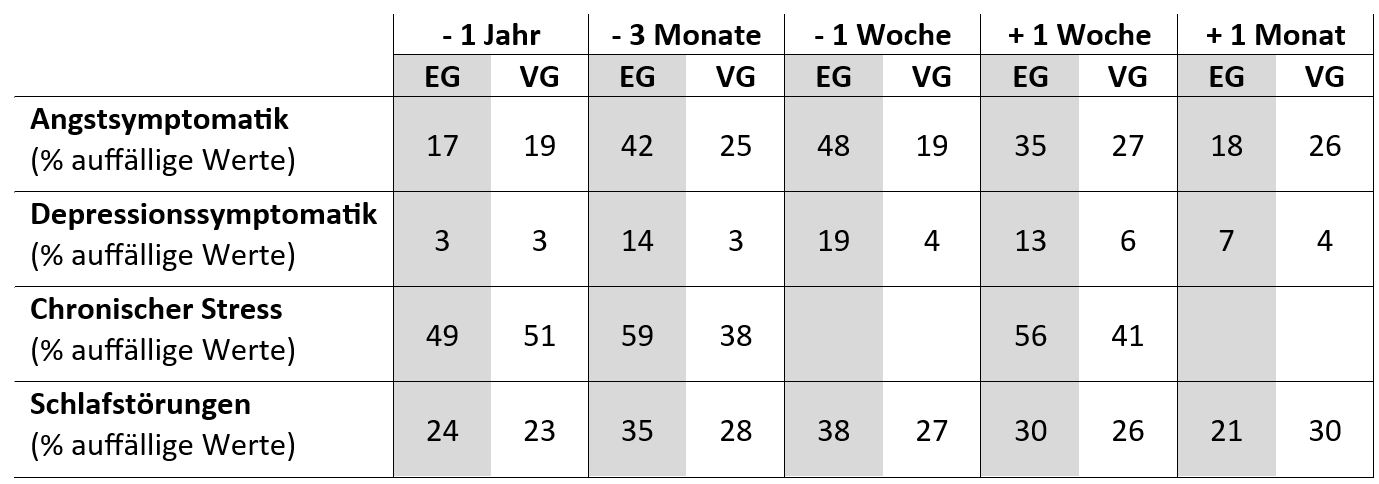 Die Vorbereitungszeit auf das Examen betrug im Mittel 13,8 Monate, wobei sich diese individuell stark unterschied (Range: 2 – 24 Monate). Die Lernstunden pro Woche wiesen bis zum Zeitpunkt des Examenstermins einen starken Anstieg auf mit einem Maximum von im Mittel etwa 50 h/Woche eine Woche vor dem Examen. Zum Vergleich: Die Lernzeit der VG betrug zu allen Messzeitpunkten etwa 35 – 38 h/Woche. Bezogen auf das Stresserleben der Studierenden war die Stress-Skala unser wichtigstes Messinstrument. Diese Skala wurde aus den Daten des ambulanten Assessments generiert, was es uns ermöglichte, das wahre Ausmaß des Stresserlebens der Teilnehmer:innen in ihrem Alltag zu erfassen. Verglichen zum ersten Messzeitpunkt ein Jahr vor dem Examenstermin zeigten die Studierenden der EG einen starken Anstieg des Stressniveaus bis kurz vor Prüfungsbeginn. Bereits eine Woche später sinkt dieses Niveau allerdings unter den Ausgangswert und auch unter den Wert der Vergleichsgruppe. Sehr ähnliche Verläufe zeigten sich für die Angst- und Depressionssymptomatik, verschiedene Faktoren des chronischen Stresserlebens (z.B. Arbeitsüberlastung, Arbeitsunzufriedenheit oder chronische Besorgnis) und die Ausprägung von Schlafstörungen. Auffällig waren hierbei auch die teilweise bedenklich hohen Raten an auffälligen Testwerten. So wiesen beispielsweise 17% der EG-Teilnehmer:innen zu Beginn der Studie auffällige Werte hinsichtlich der Angstsymptomatik auf, eine Woche vor der Ersten Juristischen Staatsprüfung lag dieser Wert bei 48%, einen Monat nach der Prüfung wieder bei 18%. Tabelle 1 zeigt die Rate an auffälligen Werten im Verlauf der Studie für die Konstrukte Angst, Depression, chronischer Stress und Schlafstörungen.