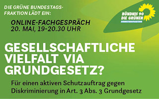 Die Grüne Bundestagsfraktion lädt zu einem Online-Fachgespräch ein: am 20. Mai von 19:00-20:30 Uhr. Wir diskutieren eine Ergänzung von Artikel 3 Abs. 3 GG um positive Verpflichtungen des Staates im Zusammenhang mit Diskriminierungsverboten mit