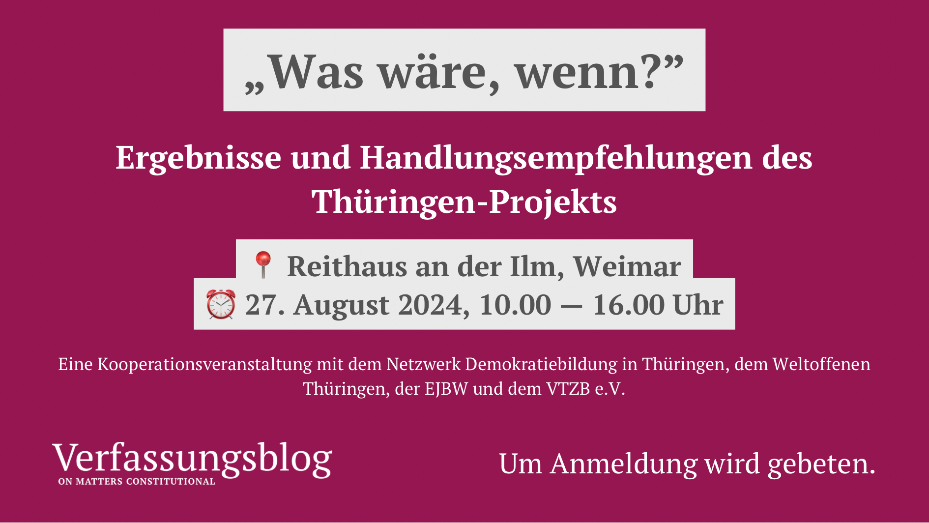 Am 27. August stellen wir in fünf verschiedenen Panels die Handlungsempfehlungen und Ergebnisse unseres Thüringen-Projekts vor. Die Kooperationsveranstaltung mit dem Netzwerk Demokratiebildung in Thüringen, dem Weltoffenen Thüringen, der EJBW und dem VTZB e.V. findet von 10 bis 16 Uhr im Reithaus an der Ilm in Weimar statt.